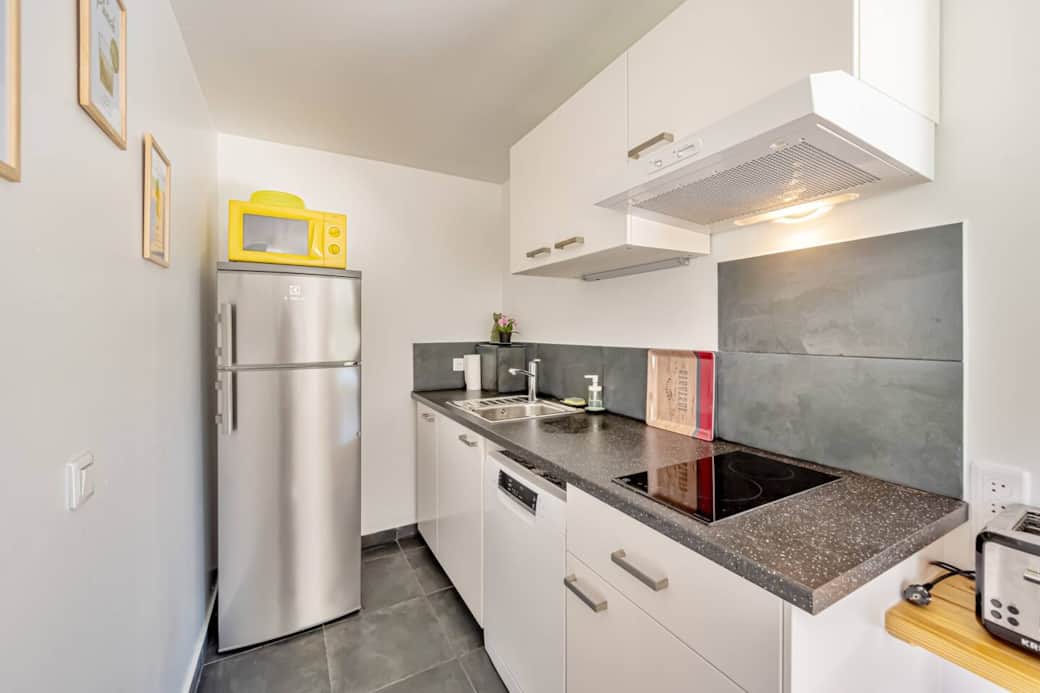 La cuisine entièrement équipée comprend tout le nécessaire notamment un lave-vaisselle, des plaques de cuisson vitraux, une cafetière senseo et un four à micro-ondes. Vous n'avez plus qu'à concocter de délicieux repas.